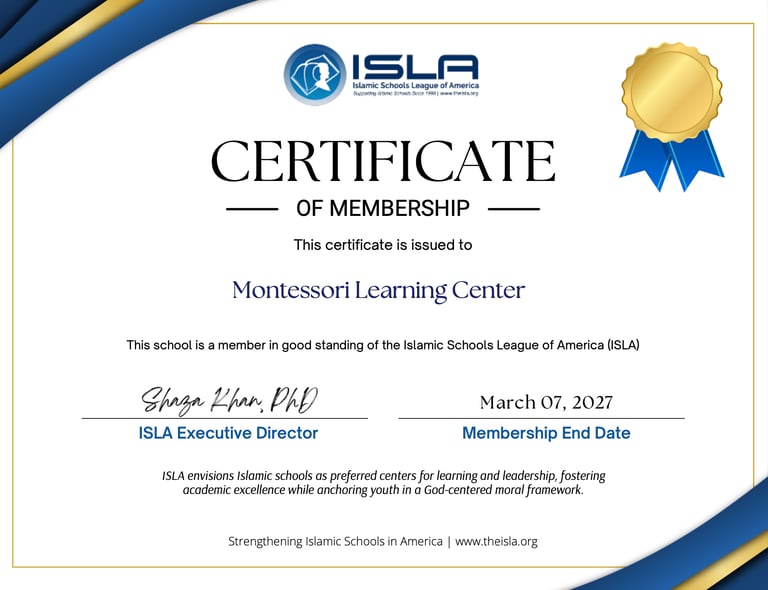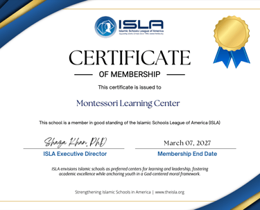 Our school is honored to be an official member of the Islamic Schools League of America (ISLA), a network of Islamic schools dedicated to advancing excellence in education, leadership, and collaboration across North America.